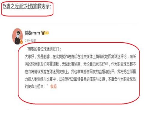 后来,赵睿也是就此事进行了道歉,表示自己当时是情绪化地回应了球迷的评论,很不应该,因此,特别向球迷进行道歉。与此同时,赵睿还表示自己作为一个职业篮球运动员,就应该控制好自己的情绪,不管在什么时候,都不应该将自己的情绪发泄到球迷身上。在未来,自己肯定会专注于训练,专注于比赛。同时,也是接受大家的监督和批评。