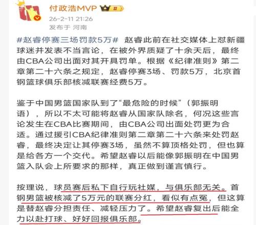 至于为何要处罚赵睿,原因就是,2月1日,北京队与青岛队的比赛之后,赵睿在网络上回应了新疆队球迷的吐槽,从赵睿所言来看,完全就是不经大脑的发言。这也是引起了很多新疆队球迷的不满。