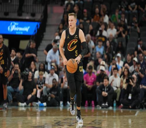 骑士球员梅里尔本场比赛手感冰凉,三分线外出手全部打铁,没有提供上火力支援。