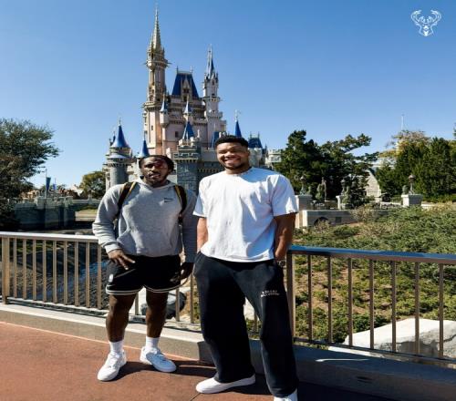 雄鹿官方社媒配文写道:“两个游玩迪士尼的大孩子。”