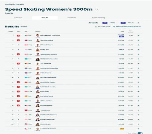 米兰冬奥会速度滑冰女子3000米决赛,中国选手杨滨瑜获得第17名,意大利名将洛洛布里吉达破奥运纪录获得金牌。