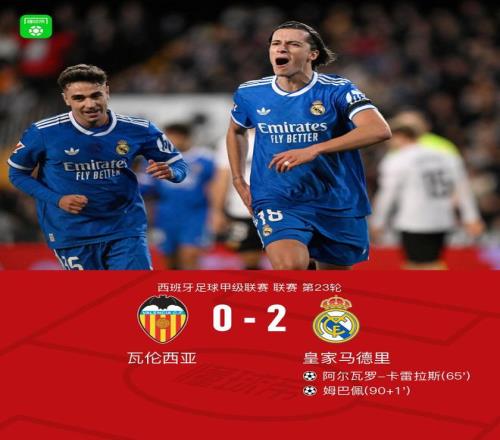 北京时间2月9日西班牙足球甲级联赛 联赛 第23轮,瓦伦西亚主场对阵皇家马德里。皇家马德里阿尔瓦罗-卡雷拉斯破门,姆巴佩破门。最终比分瓦伦西亚 0-2 皇马。