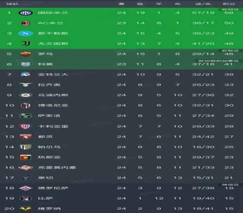 罗马本轮在主场2-0战胜了卡利亚里。亚特兰大、拉齐奥、乌迪内斯和博洛尼亚的积分在30分以上暂列第7-第10名。萨索洛、卡利亚里、都灵、帕尔马、热那亚、克雷莫内塞、莱切暂列第11-第17名。排在最后三名的是18分佛罗伦萨、15分比萨、15分维罗纳!