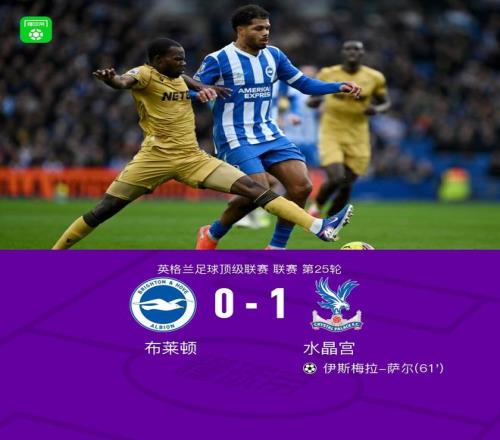 北京时间2月8日英超联赛第25轮,布莱顿主场对阵水晶宫。伊斯梅拉-萨尔推射破门打进全场唯一进球,尤尔根-拉森造险。最终,水晶宫1-0客胜布莱顿,取得近13轮首胜。