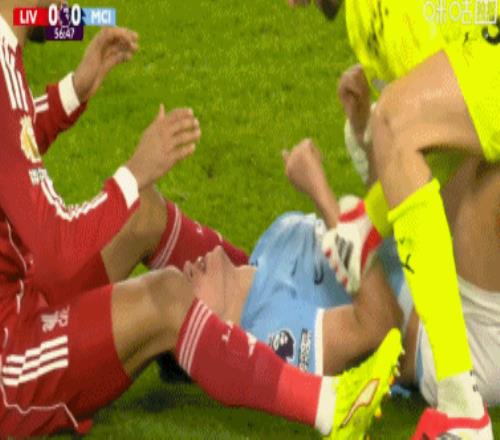 第47分钟,范戴克踢倒哈兰德,被出示黄牌