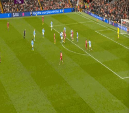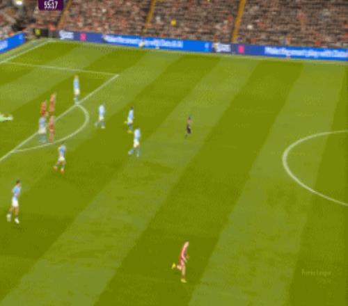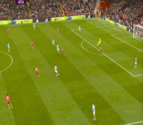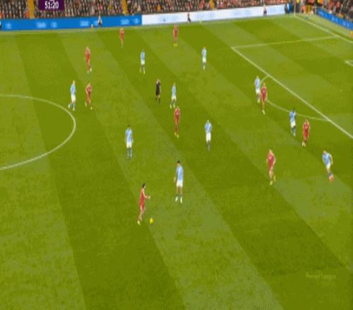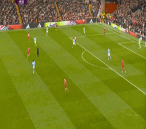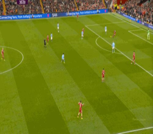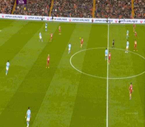 当然了,利物浦的进攻威胁程度和曼城还是没法比,萨拉赫的确不负当年之勇,但埃基蒂克和维尔茨也没有什么像样的表现,所以曼城很快重新掌握大局,在第33分钟,用利物浦的失误和自身的跑位,带着维尔茨的罗德里在右路送出了传中: