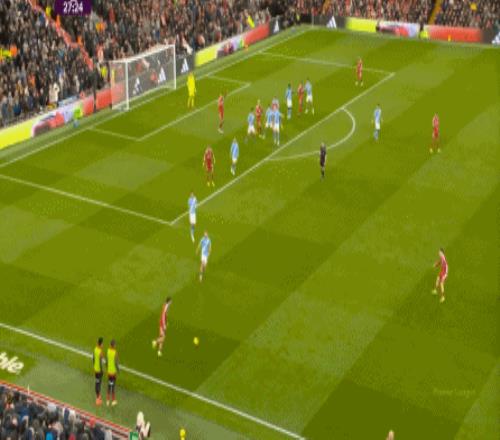 而在利物浦高位逼抢下的传中没有形成机会之后,曼城发动反击,这一路上,利物浦多次助攻,让曼城还是完成了禁区外的远射起脚: