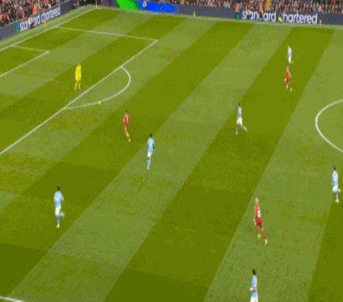 到了这个时候,有经验的教练就会有所警惕了,但利物浦还在进行高位逼抢,尽管他们可以逼迫曼城开大脚,但大脚落到前场,曼城有机会凭借前场的个人能力直接形成进攻: