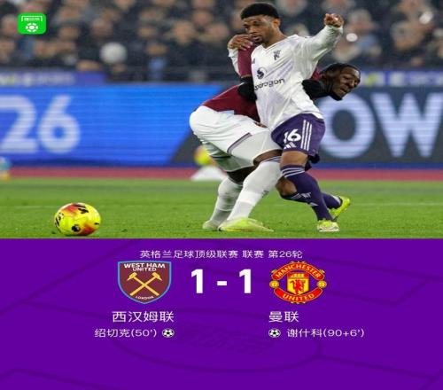 北京时间2月11日英格兰足球顶级联赛 联赛 第26轮,西汉姆联主场对阵曼联。西汉姆联绍切克破门。曼联谢什科破门。最终比分西汉姆联 1-1 曼联。